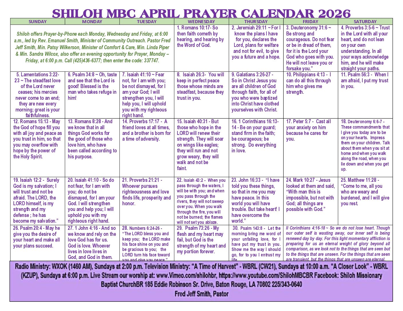 SHILOH MBC APRIL 2026 PRAYER CALENDAR Shiloh offers Prayer-by-Phone each Monday, Wednesday and Friday, at 6:00 a.m., led by Rev. Emanuel Smith, Minister of Community Outreach. Pastor Fred Jeff Smith, Min. Patsy Wilkerson, Minister of Comfort & Care, Min. Linda Piper & Min. Sandra Wilcox, also offer an evening opportunity for Prayer, Monday – Friday, at 6:00 p.m. Call (425)436-6377; then enter the code: 337747. LINK: https://acrobat.adobe.com/id/urn:aaid:sc:US:a320e53f-1e90-4a57-875f-9f5ca18d7e7b PRAYER: Lord, thank You for the Christ—for who He is, for what He has done, and for the change He has brought into our lives. As we go into this day, let others see the Christ in us. Let them be drawn to know Him more deeply. In the name of Your Son, our Lord, we pray. Amen. |